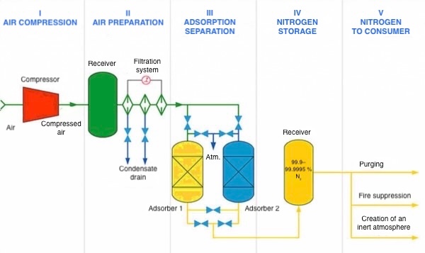 Atmospheric air consists of approximately 78.1 % nitrogen, 20.8 % oxygen, 0.9 % argon, and about 0.2 % of other noble gases. Gaseous nitrogen is widely used in processes that require an inert environment. There are several ways to supply nitrogen to a production site: delivery in high-pressure cylinders or as liquid nitrogen, or on-site generation using membrane systems, cryogenic plants, or PSA (Pressure Swing Adsorption) units.