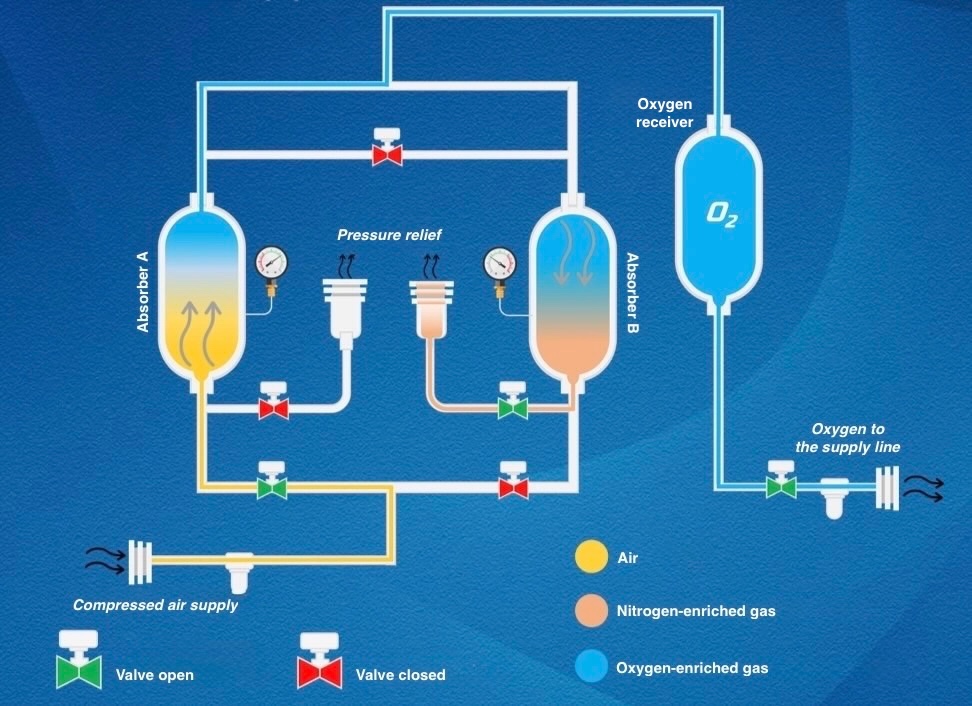 ONH Systems medical oxygen generators operate on the Pressure Swing Adsorption (PSA) principle, separating oxygen from air using a molecular sieve that selectively adsorbs nitrogen under pressure.