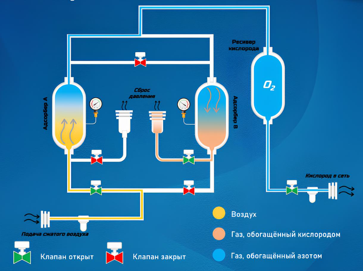 Чтобы получить кислород методом короткоцикловой адсорбции (КЦА) применяется синтетический цеолит, который специально структурирован и обладает большим количеством пор требуемого размера. Оборудование функционирует следующим образом: