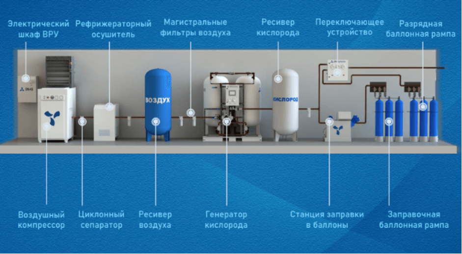 - Цикл многократно повторяется. Из ресивера кислород отправляется на компрессор для заправки в баллоны.
